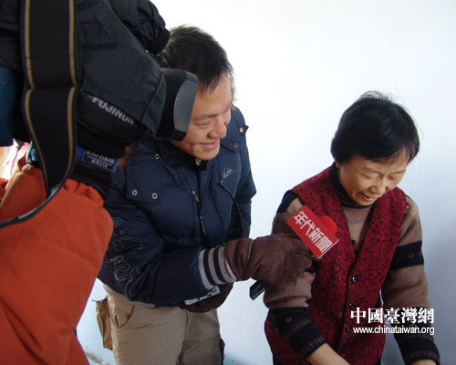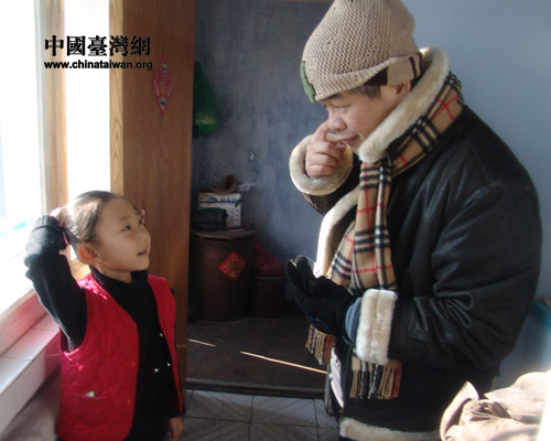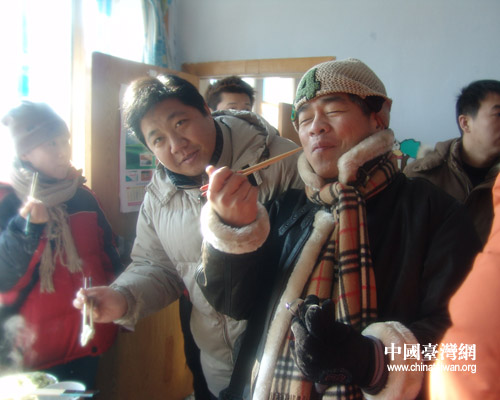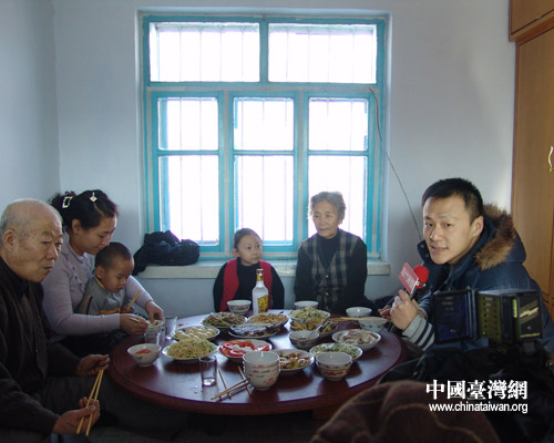 記者們到達(dá)時(shí),王慶榮一家人正在吃午飯。臺灣年代電視臺的記者陳立國經(jīng)不住火炕的溫暖,地道的東北農(nóng)家菜的吸引,爬上火炕與大家坐到一起。