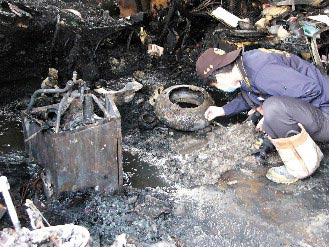 臺(tái)南縣六甲鄉(xiāng)修車廠3死火警,疑似起火點(diǎn)的神桌已被燒成灰燼,消防局鑒識(shí)人員在原來(lái)神桌擺放處找尋蛛絲馬跡,一尊神像被棄置在圖片左方。臺(tái)灣《聯(lián)合晚報(bào)》記者謝進(jìn)盛攝