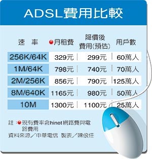 全臺有480萬ADSL寬帶上網家庭用戶,其中420萬戶是此次降價受惠者,中華電信占340萬戶左右。另60萬戶有線電視CABLE上網的使用者不在這次降價范圍內。