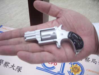 李麗美遭逮捕后,竟然大言不慚地向警方表示,她皮包內(nèi)還有一把手槍。警員翻開皮包,赫然發(fā)現(xiàn)竟然有一把僅10公分長的特勤人員迷你型掌心雷左輪改造手槍以及子彈。警方還在張某身上查獲一把“PPK二二”手槍及10顆子彈。