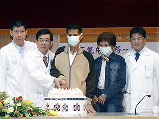 病人陳先生(中)幸運(yùn)出院,與醫(yī)療團(tuán)隊(duì)切蛋糕慶生。(圖:東森新聞)