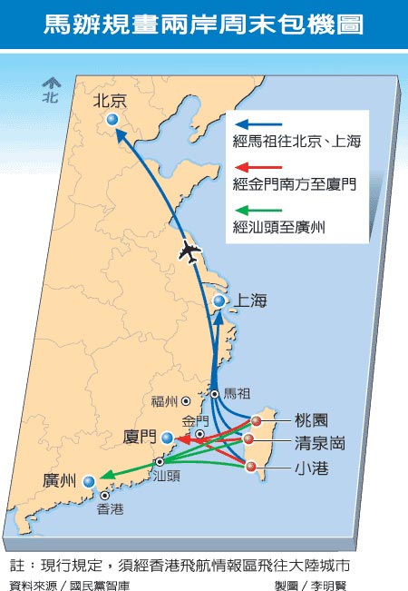 報道稱,為加速兩岸周末包機進程,馬英九昨聽取智庫永續發展組召集人陳世圯簡報,就直航時間、航點等細節交換意見,智庫規劃兩岸飛行航線采“截彎取直”模式,最多可以節省近一半的飛行時間,馬當場裁示“積極辦理”。