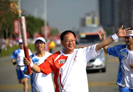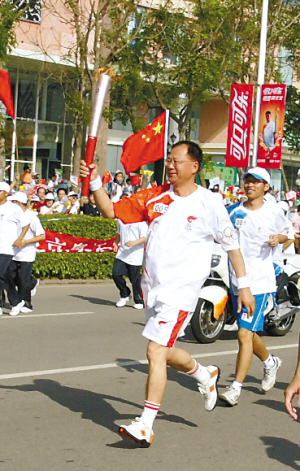 5月9日,北京奧運(yùn)圣火傳遞活動(dòng)在惠州舉行,臺(tái)商奧運(yùn)火炬手楊平和手持火炬?zhèn)鬟f。新華社記者劉大偉攝
