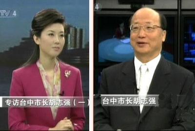 臺(tái)中市長(zhǎng)胡志強(qiáng)接受中央電視臺(tái)《海峽兩岸》主持人李紅的專訪。(圖片來源:電視截圖。)