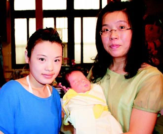 臺灣地區第2000萬個寶寶沈姿伶(左)昨天探視第2300萬個寶寶吳承恩(中),一旁吳承恩的媽媽林淑貞很開心。臺灣《聯合報》圖