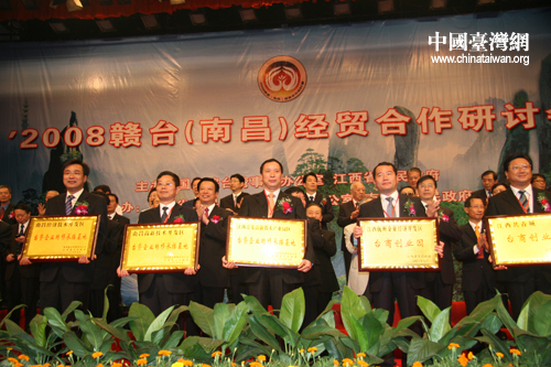 在儀式上,為此次設(shè)立的5個(gè)臺(tái)資企業(yè)轉(zhuǎn)移承接基地和5家臺(tái)商創(chuàng)業(yè)園進(jìn)行了授牌。它們分別是:南昌高新技術(shù)開發(fā)區(qū)臺(tái)資企業(yè)轉(zhuǎn)移承接基地、南昌經(jīng)濟(jì)技術(shù)開發(fā)區(qū)臺(tái)資企業(yè)轉(zhuǎn)移承接基地、江西贛州經(jīng)濟(jì)開發(fā)區(qū)臺(tái)資企業(yè)轉(zhuǎn)移承接基地、江西吉安高新技術(shù)產(chǎn)業(yè)園區(qū)臺(tái)資企業(yè)轉(zhuǎn)移承接基地、江西上饒經(jīng)濟(jì)開發(fā)區(qū)臺(tái)資企業(yè)轉(zhuǎn)移承接基地,以及江西撫州金巢經(jīng)濟(jì)開發(fā)區(qū)臺(tái)商創(chuàng)業(yè)園、江西共青城臺(tái)商創(chuàng)業(yè)園、江西上高臺(tái)商創(chuàng)業(yè)園、江西瑞金臺(tái)商創(chuàng)業(yè)園、江西向塘臺(tái)商創(chuàng)業(yè)園。