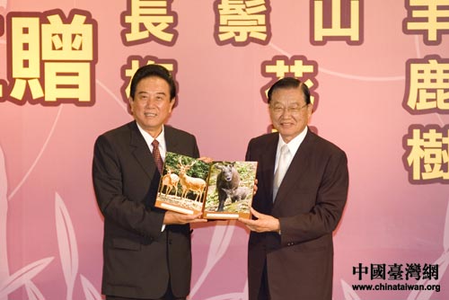 陳云林江丙坤舉行互贈(zèng)儀式,陳云林向江丙坤贈(zèng)送“團(tuán)團(tuán)”、“圓圓”圖譜,江丙坤向陳云林贈(zèng)送長(zhǎng)鬃山羊和梅花鹿圖譜。(本網(wǎng)特派記者田云鵬 發(fā)自臺(tái)北)