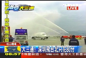 中國臺灣網(wǎng)12月15日消息 據(jù)臺灣TVBS電視臺報道,深圳航空ZH9095航班今早8時40分提前飛抵臺北松山機場,這架從深圳起飛的航班成為兩岸直接“三通”首個抵達臺灣的大陸航班。