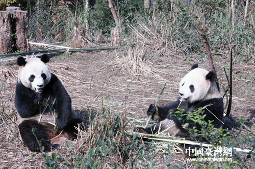 “團團”、“圓圓”在雅安碧峰峽大熊貓飼養基地內開心進食。(鐘寶華 攝)