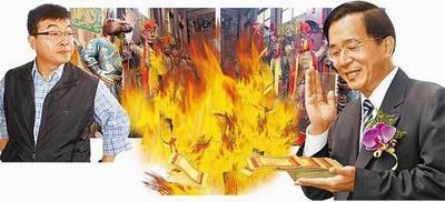 陳水扁許多弊案都是邱毅(左)爆料揭露,傳陳水扁聽從仙姑指示,燒紙錢祈求化解與邱毅的前世恩怨。臺灣《蘋果日報》設計畫面