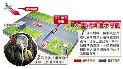 就在江姓營長座車穿越主跑道時,剛好有架IDF戰(zhàn)機準備降落,塔臺正要導(dǎo)引戰(zhàn)機下降時,接到飛機輔助室通知跑道上有車,才緊急要求戰(zhàn)機重飛,并要求負責(zé)跑道導(dǎo)引的導(dǎo)引憲兵車駛離。