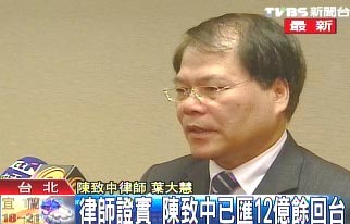 陳致中的律師葉大慧今天下午表示:“海外分為兩批,一批是原來被瑞士檢方所查扣的7億,另外,國泰世華銀行那邊查到的5億多,也匯到海外去。那這兩筆錢,陳致中先生已經行文給當地的銀行,希望他們把這些錢匯回臺灣,到特偵組所指定的戶頭,他都已經把信函發文給銀行,都在1月份就已經陸續做了。”(高大林)
