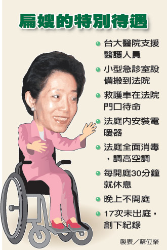 由于吳淑珍有低血壓癥狀,為照顧她的身體,法院請求臺大醫院支持,派出兩名醫師及兩名護士,隨時注意她的身體狀況;另外一部加護型的救護車,設備有心電圖、電擊器、折迭病床等,停在法庭外門口,因應突發狀況。