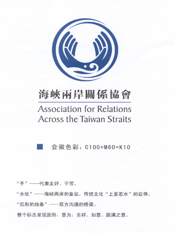 海協會徽記公告指出,翻卷的浪花及交融的水紋,象征著海峽兩岸割舍不斷的聯系;“浪花”中升涌而成的雙手,滿掬欲握,形象表達了兩岸同胞交流合作、平等協商的共同愿望,也點染出海協會承擔的歷史使命。動感的雙弧線交匯成一個圓形將浪花和雙手緊緊包容,體現了中華文化中“和諧”、“圓融”的精神,寓意著兩岸同胞血脈相連,命運與共,攜手推進兩岸關系和平發展,共同實現中華民族偉大復興。