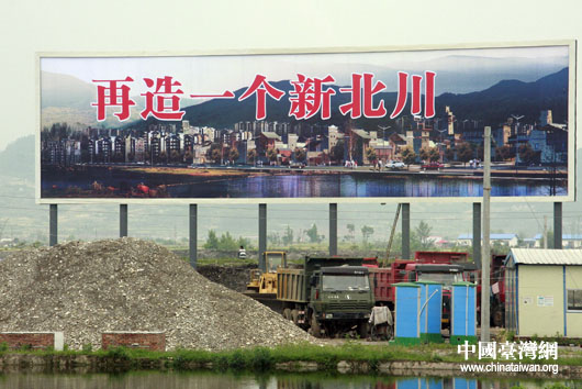 “再造一個(gè)新北川”的巨幅規(guī)劃圖巍然屹立在北川新城建設(shè)施工現(xiàn)場(chǎng)。(中國(guó)臺(tái)灣網(wǎng) 鐘寶華 攝)