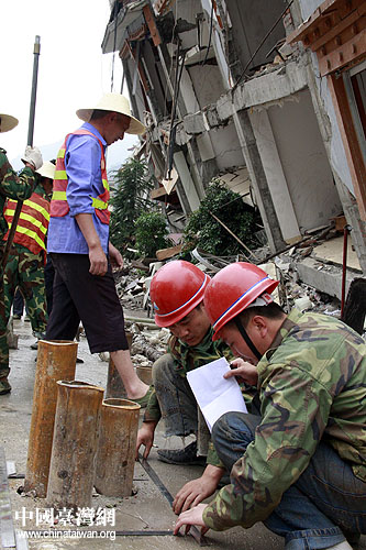 北川老縣城內(nèi),施工工人正在緊張忙碌,對(duì)傾危建筑進(jìn)行加固作業(yè),這里將建成地震遺址博物館。(中國(guó)臺(tái)灣網(wǎng) 鐘寶華 攝)