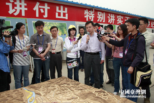 北川新城地址上,北川縣副縣長(zhǎng)賀旺為兩岸媒體介紹北川新城規(guī)劃建設(shè)情況。(中國(guó)臺(tái)灣網(wǎng) 鐘寶華 攝)