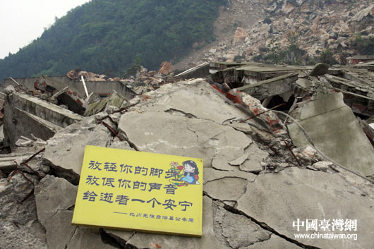 5日上午,聯(lián)合采訪團(tuán)被特批進(jìn)入北川老縣城采訪。雖然已經(jīng)過去1年,但北川縣城滿目瘡痍的景象依然觸目驚心,“放輕你的腳步,放低你的聲音,給逝者一個(gè)安寧”的提示牌安放在廢墟之上,更讓人心情沉重,兩岸記者一行敬獻(xiàn)上花籃并行鞠躬禮,表達(dá)對(duì)地震中遇難同胞的哀思。