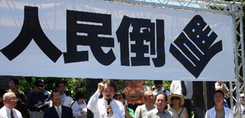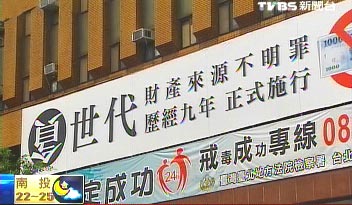 臺灣法務(wù)部門宣導(dǎo)財產(chǎn)來源不明罪,被疑暗諷陳水扁。上圖為臺北地檢署外的宣導(dǎo)白布條,下圖為2006年紅衫軍倒扁時的標語。