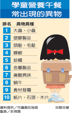 莊瑞雄并向臺北市教育局調(diào)閱近兩年來各小學營養(yǎng)午餐紀錄,發(fā)現(xiàn)菜肴里曾出現(xiàn)各種蟲類的共有109件;其次是塑料片、塑料袋碎屑,共有92件,另外毛發(fā)也高達40件;讓人覺得可怕的還有蟑螂。