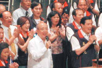 國民黨主席唯一候選人馬英九(右),與現任主席吳伯雄帶動全場唱“團結力量大”。臺灣《聯合報》圖片