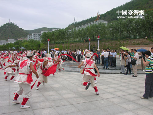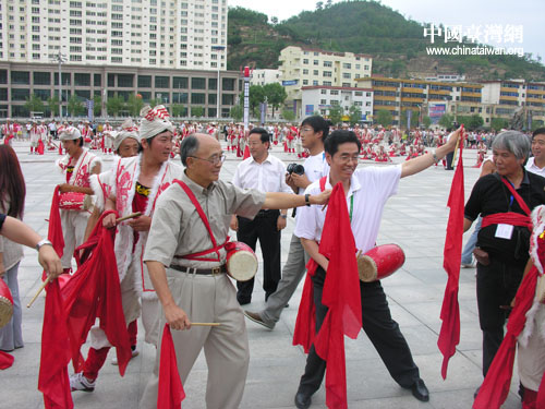 中國臺灣網7月21日陜西延安消息 “情系長安——兩岸文化聯誼行”活動21日走進安塞縣,氣勢磅礴、風格獨特、豪邁粗獷、剛勁奔放的安塞腰鼓,使臺灣文化界人士震憾,紛紛加入其中與安塞腰鼓手一同起舞,臺灣藝術大學舞蹈系教授曾照熏激動的說,安塞腰鼓讓人激動,這是蘊藏在民間的偉大的藝術。