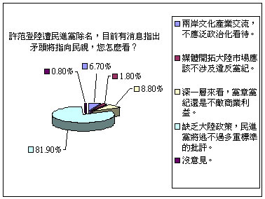 中國臺灣網7月29日消息 臺灣《中時電子報》最新在線民調“許、范登陸遭民進黨除名,目前有消息指出矛頭將指向民視,您怎么看?” 至29日上午8點為止,累計投票897票,超過八成參與投票的臺灣網友選擇“缺乏大陸政策,民進黨將逃不過多重標準的批評。”