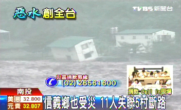中國臺灣網8月10日消息 據臺灣TVBS電視臺報道,臺風重創南臺灣,但中臺灣的南投信義山區災情也不少,東埔村一處養鱒場目前還有11個人失聯,另外神木村也有15戶民宅,被泥石流淹沒,300個人緊急疏散;包括羅娜、新鄉和同富等5個村落,對外交通完全中斷,急需相關單位盡快搶信道路。