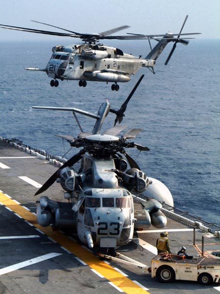 資料圖:一架美國海軍陸戰(zhàn)隊(duì)遠(yuǎn)征旅的CH-53E“海上種馬”直升機(jī)準(zhǔn)備降落到兩棲攻擊艦上。甲板上的那架已經(jīng)折疊起旋翼,準(zhǔn)備拖走。
