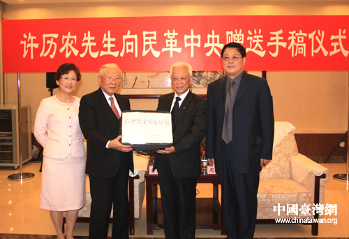 臺灣新同盟會會長許歷農(左二)向民革中央主席周鐵農贈送手稿。(中國臺灣網 高斯斯 攝)