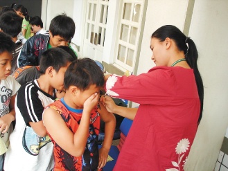 那瑪夏鄉(xiāng)民生小學(xué)學(xué)生在寄讀的鼓山小學(xué)接種新流感疫苗,有些學(xué)童害怕看針筒而捂著眼睛。 來源:臺(tái)灣《聯(lián)合報(bào)》