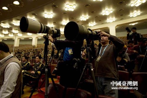 3月3日下午,全國政協十一屆三次會議在北京人民大會堂開幕,圖為各路記者在人民大會堂拍攝開幕式盛況。(肖春陽、劉洋攝影報道)