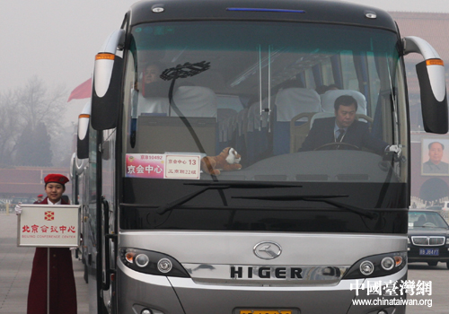 全國政協十一屆三次會議今天下午開幕,圖為臺籍委員駐地北京會議中心大巴。(中國臺灣網 張弛 攝)