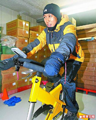 現年23歲的陳彥博喜歡的名言是:“夢想就像藏寶圖,需要自己去拿鑰匙打開!”為適應北極酷寒,他昨日起在臺北市某超市的凍庫展開3天模擬低溫訓練。 超市的冷凍庫,一般人無法待上5分鐘忍受-20℃低溫,陳彥博為加強訓練心肺功能和肌耐力,著極地裝練習飛輪、跳繩運動,約90分鐘練習結束后,他氣喘吁吁地說:“好冷,頭部暈眩。”此刻飛輪上零件早已結冰,電子屏幕也起了霧,陳彥博卻是一副為了圓夢、再苦也值得的表情。