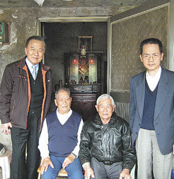 臺灣“監(jiān)委”余騰芳(左)和李炳南(右)在澎湖牛心灣訪談當?shù)乩先耍?6歲的黃保安(左二)當年是負責保護特攻隊的炮長,和薛必移(右二)同是日軍荒鷲中隊的成員。 來源:臺灣《中國時報》