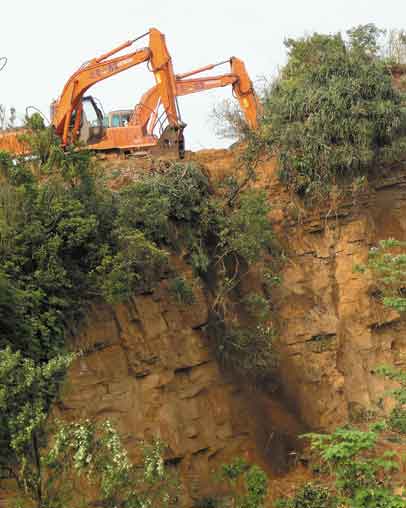 上午,挖土機爬到最頂端清除土方。圖片來源:臺灣《聯合晚報》