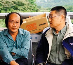 兩位焦急的父親,李錫昌(左)、郭恒龍(右)的子女可能被山崩掩埋,兩人在現(xiàn)場只能等待和互相打氣。圖片來源:臺灣《聯(lián)合報》
