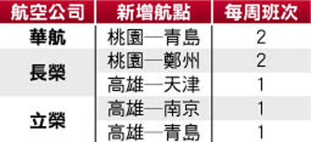 臺當(dāng)局“民航局”昨公布島內(nèi)航空公司新增航班分配結(jié)果,華航和長榮集團(tuán)各取得15班,復(fù)興航空分得6班。新航線包括:華航的桃園飛青島、長榮的桃園飛鄭州和高雄飛天津,立榮的高雄飛南京和青島,新增航線每周共飛7班。