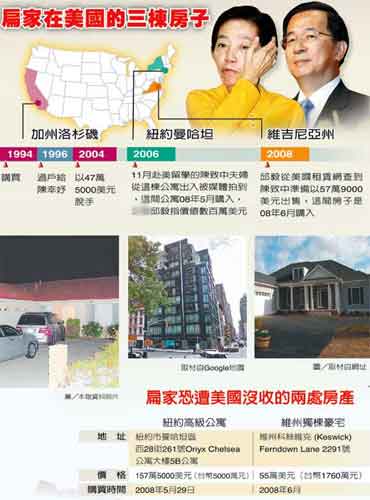 依美國資料,陳水扁家在紐約市近曼哈頓八大道鬧區(qū)的豪華公寓,售價157萬5千美元(約臺幣5000萬元),在2008年5月29日購買;在弗吉尼亞要價55萬美元(約新臺幣1760萬元)的獨(dú)棟住宅,在同年6月購得。