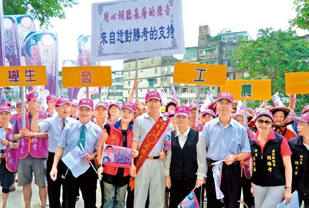 尋求4連霸的臺(tái)北縣議員周勝考(中),在士農(nóng)工商及學(xué)生等代表陪同下,一同前往臺(tái)北縣選委會(huì)登記參選新北市議員。來(lái)源:臺(tái)灣《中國(guó)時(shí)報(bào)》
