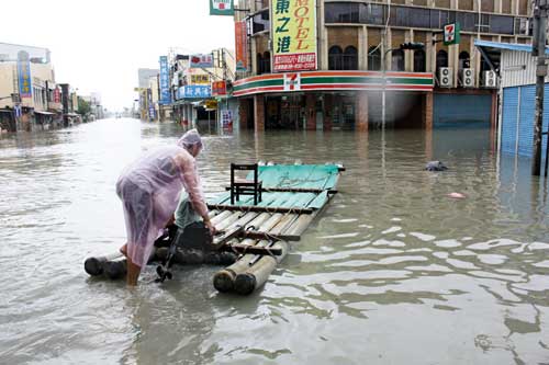 屏東縣林邊鄉積水,四處一片汪洋,鄉民找來竹筏進出。 來源:臺灣《聯合報》