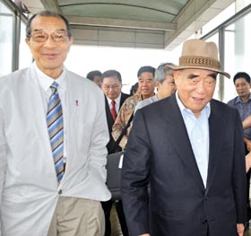 金門協議簽署20周年,中秋前夕兩岸紅十字組織代表重回金門簽署地“仁愛新莊”聚首,當年臺灣簽署代表陳長文(左),昨天與郝柏村(右)飛抵金門。圖片來源:臺灣《聯合報》