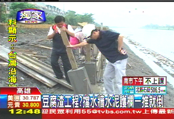 據畫面顯示,前來調查的一名高雄市議員可以不費力的用2根手指把水泥臺座推倒,工程的“豆腐渣”程度還真讓人不可思議。高雄市楠梓地區里長怕水災噩夢重演,要求承包商立即停工調查。承包商表示,這是圖紙公司設計問題,我們只是按照圖施工。