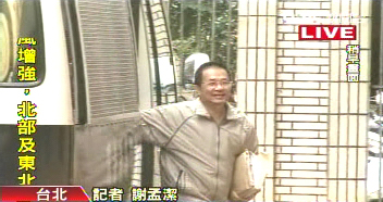 陳水扁拿著裝有卷宗的黃色牛皮紙裝,向在場媒體揮手致意后在戒護人員陪同下快速步入法院。
