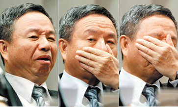 楊志良出席記者會時顯得有些疲倦,不時強忍哈欠,并用力的以手抹臉提神。 來源:臺灣《聯(lián)合晚報》