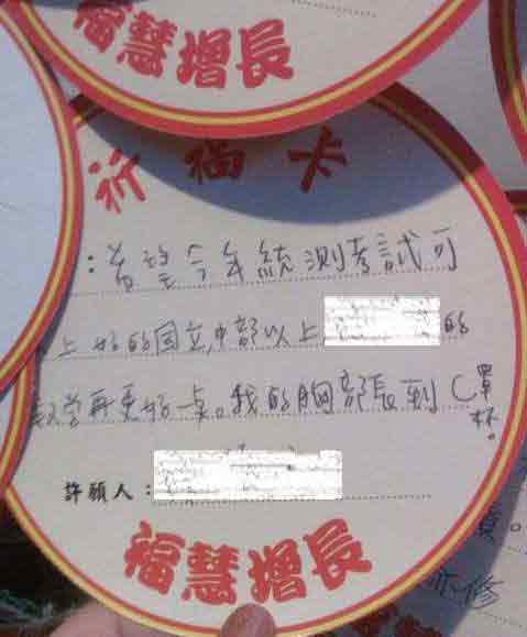 中國臺(tái)灣網(wǎng)2月9日消息 據(jù)臺(tái)灣“今日新聞網(wǎng)”報(bào)道,臺(tái)灣一名正妹網(wǎng)友nanaling過年期間到關(guān)帝廟拜拜時(shí),赫然發(fā)現(xiàn)在文昌帝君(民間和道教尊奉的掌管士人功名祿位之神。文昌本星名,亦稱文曲星,古時(shí)認(rèn)為是主持文運(yùn)功名的星宿)面前出現(xiàn)一張讓人捧腹的許愿卡?ㄆ藢懮舷M荚嚹軌蝽樌脑S愿文字,后面竟然還寫道愿“我的胸部長(zhǎng)到C罩杯”,讓人不禁哈哈大笑。