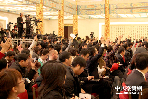 十一屆全國人大四次會議于3月4日(星期五)上午11時在人民大會堂三層金色大廳舉行新聞發(fā)布會,由大會發(fā)言人李肇星就會議議程和人大工作相關(guān)問題回答中外記者的提問。(中國臺灣網(wǎng) 王偉 攝)