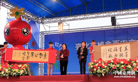 著名書法家邱宗康、石瑞芳為花博獻上書法作品(陜西省臺辦 張群莉 攝)