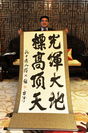 周進華帶來國民黨榮譽主席連戰的老師陳大絡給陳光標的題詞。圖片由陳光標本人提供