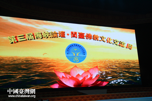 “第三屆海峽論壇·閩臺(tái)佛教文化交流活動(dòng)周”9日晚間在福州開(kāi)幕,圖為開(kāi)幕式背景板,蓮花盛放在海峽間。(中國(guó)臺(tái)灣網(wǎng) 楊麗 攝)